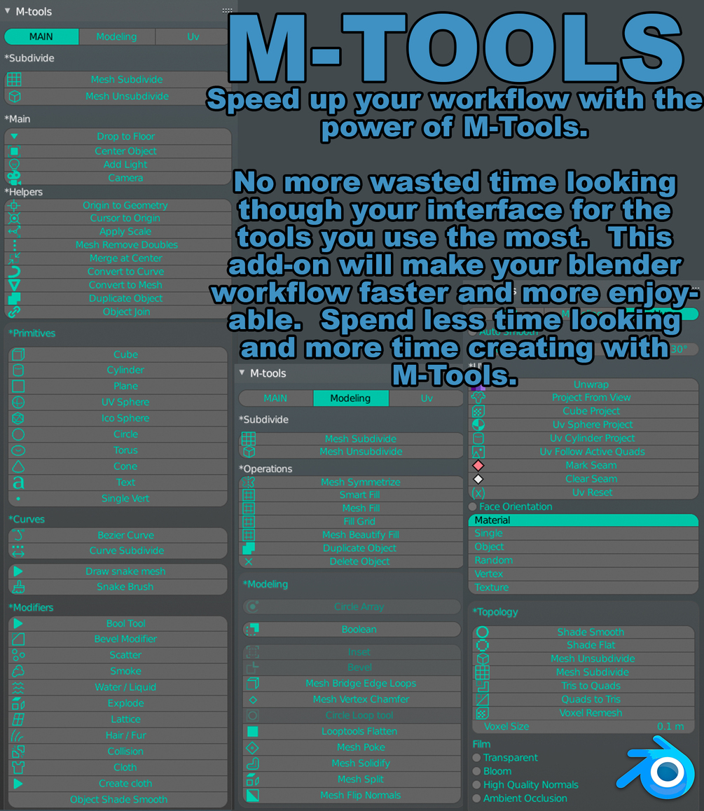 M-Tools addon for Blender$15$15https://schema.org/InStockusdJason Frieling0 ratingsM-Tools addon for Blender will add your most used tools to one N-pannel.I want this!Size38.3 KBAdd to wishlist New wishlistCopy product URL
